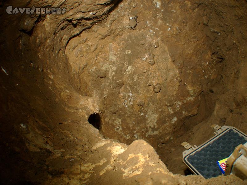 Die Decke in der Blase. Noch immer waagerecht. Nur jetzt grösser. Der Fels im Bild links bildet den Siphon. In alle weiteren Richtungen ist kein Ende zu wittern.